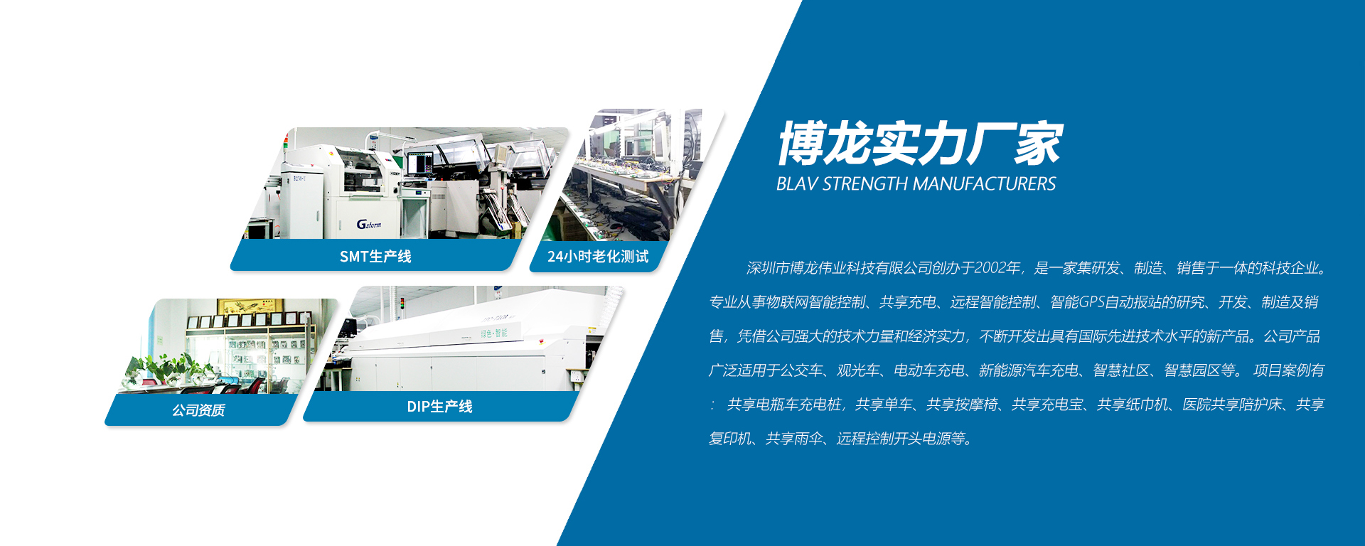 成立時(shí)間:深圳市博龍偉業(yè)科技有限公司創(chuàng)辦于2002年,是一家集研發(fā)、制造、銷售于一體的科技型企業(yè)。自主研發(fā)車載GPS報(bào)站器、車載視頻設(shè)備及安防視頻監(jiān)控、充電樁、智能遠(yuǎn)程控制等產(chǎn)品;產(chǎn)品廣泛應(yīng)用于共享單車,共享按摩椅,共享充電寶,共享紙巾機(jī),醫(yī)院共享陪護(hù)床,共享復(fù)印機(jī),共享雨傘,共享電動(dòng)車充電樁,充電柜,換電柜,遠(yuǎn)程控制開關(guān)電源,電池保護(hù)板等。 公司嚴(yán)執(zhí)行該質(zhì)量體系,對(duì)生產(chǎn)品質(zhì)進(jìn)行全方位控制,公司擁有雄厚的技術(shù)力量、先進(jìn)的生產(chǎn)、檢測(cè)設(shè)備、十余年的團(tuán)隊(duì)管理與生產(chǎn)經(jīng)驗(yàn)。曾先后榮獲多項(xiàng)專利和軟件著作權(quán)等。 我們的設(shè)計(jì)理念:安全低耗,高性能,低成本。博龍偉業(yè)以"專心、專業(yè)、專注"的